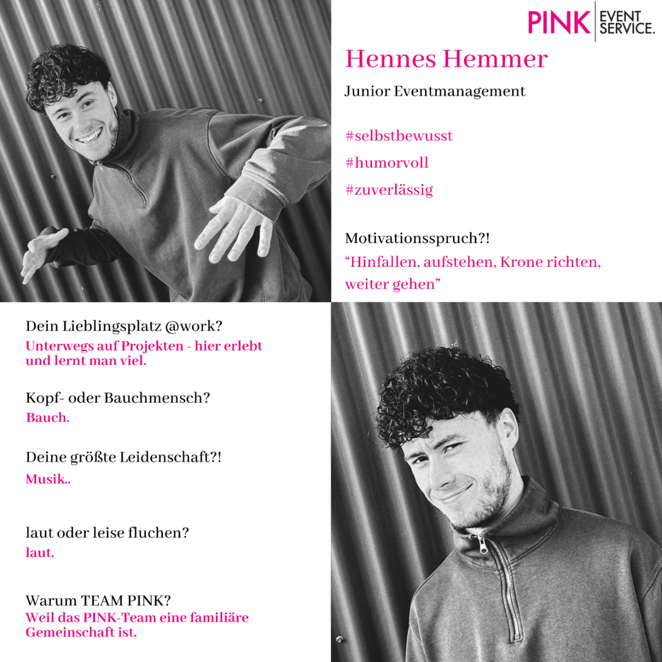 Zum Abschluss wollten wir natürlich auch wissen, wer die beiden eigentlich persönlich sind. Deshalb haben wir Laura und Hennes unsere „PINK Fragen“ gestellt – eine kleine Fragerunde, die bei uns schon Tradition hat. Dabei ging es nicht nur um berufliche Ziele, sondern auch um Motivation, persönliche Stärken, kreative Inspiration und ihre Vorstellungen von einem gelungenen Event. Die Antworten geben einen sympathischen Einblick in ihre Denkweise, ihre Begeisterung für die Branche und ihre individuellen Perspektiven – und zeigen schon jetzt, wie gut sie zu PINK passen.